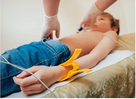 Следующий этап диагностики — это клинический осмотр. Врач оценивает соответствие роста и веса ребенка его возрасту, выслушивает сердечный ритм, осматривает кожу и слизистые оболочки, измеряет артериальное давление. На этом этапе можно заподозрить нарушение сердечного ритма, но нельзя установить его происхождение и оценить степень тяжести.